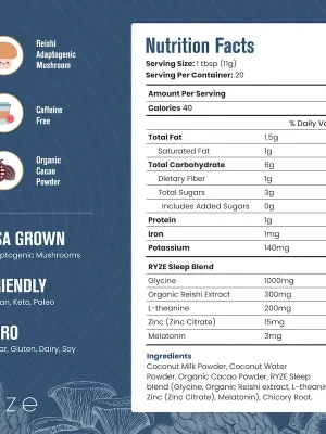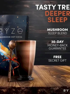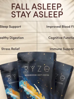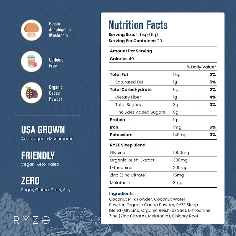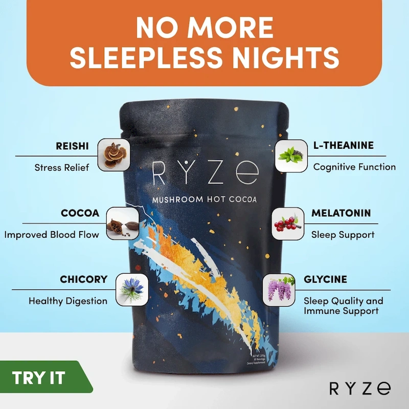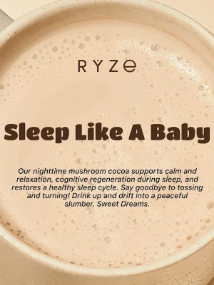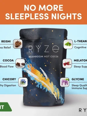 RYZE Mushroom Hot Cocoa is powered by sleep-enhancing superfoods that help you fall asleep and stay asleep all night long. All without added sugar, only 40 cal and just as delicious as regular Hot Chocolate.