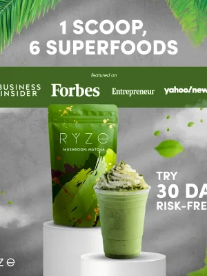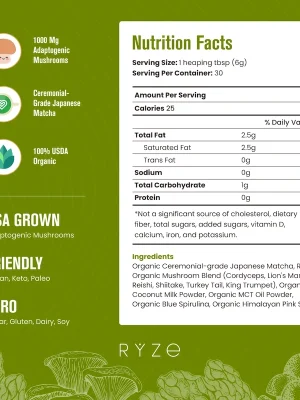 RYZE Mushroom Matcha Bundle gives you more matcha for a better price! Our creamy and delicious blend features 6 adaptogenic mushrooms and antioxidants from organic Matcha. All with zero added sugar and organic non-GMO ingredients.