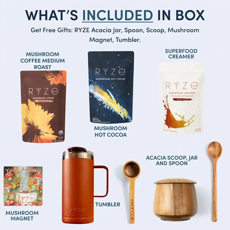 Accelerate your results with two cups a day and create your RYZE ritual. Enjoy two cups of Mushroom Coffee a day with our Superfood Creamer for an extra mushroom kick and creamy latte feel. On your first order, you’ll receive a new tablespoon scoop for perfect portioning, a mushroom jar designed to keep your blend fresh, and a spoon for stirring.