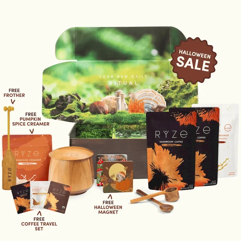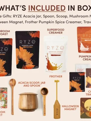 Accelerate your results with two cups a day and create your RYZE ritual. Enjoy two cups of Mushroom Coffee a day with our Superfood Creamer for an extra mushroom kick and creamy latte feel. On your first order, you’ll receive a new tablespoon scoop for perfect portioning, a mushroom jar designed to keep your blend fresh, and a spoon for stirring.