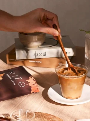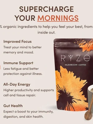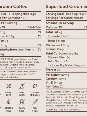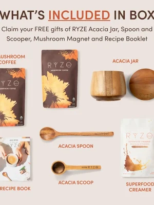 Accelerate your results with two cups a day and create your RYZE ritual. Enjoy two cups of mushroom coffee a day with our superfood creamer for an extra mushroom kick and creamy latte feel. On your first order, you’ll receive a new tablespoon scoop for perfect portioning, a mushroom jar designed to keep your blend fresh, and a spoon for stirring.
