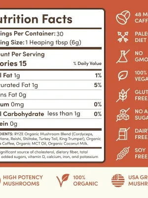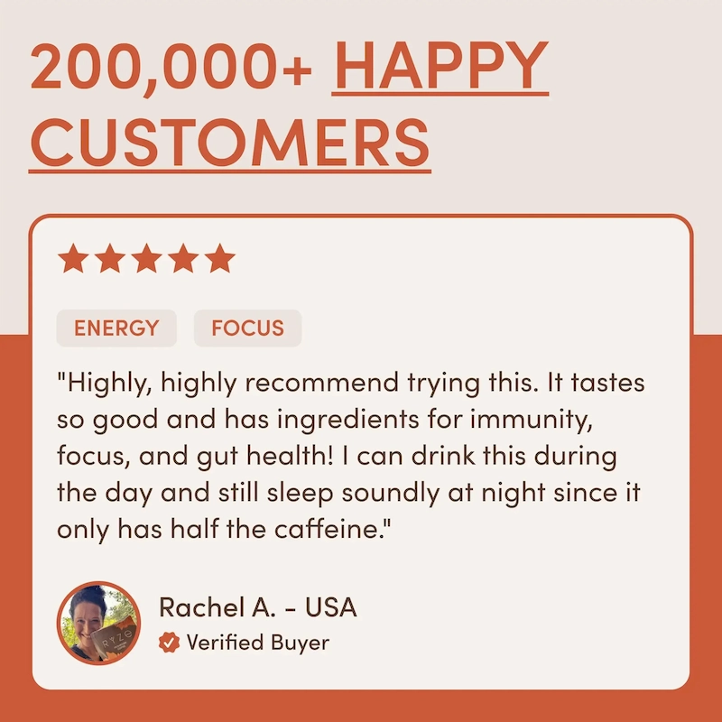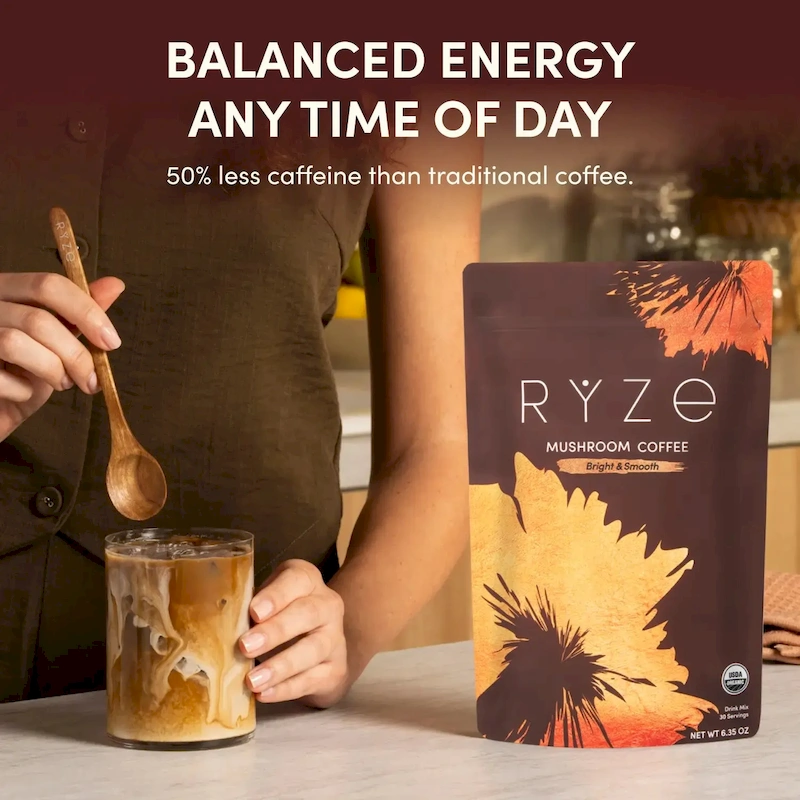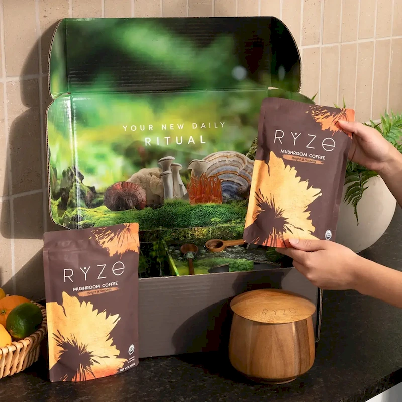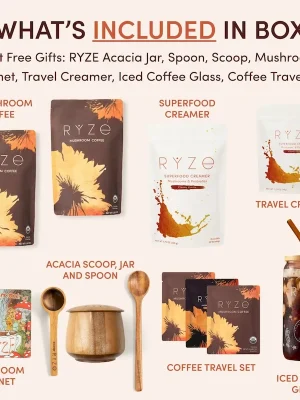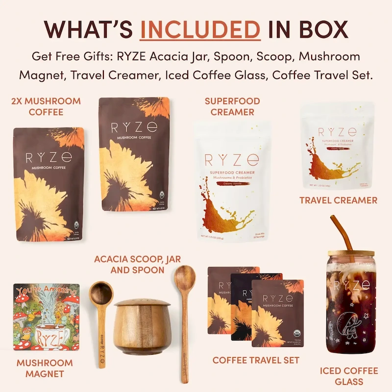 Accelerate your results with two cups a day and create your RYZE ritual. Enjoy two cups of Mushroom Coffee a day with our Superfood Creamer for an extra mushroom kick and creamy latte feel. On your first order, you’ll receive a new tablespoon scoop for perfect portioning, a mushroom jar designed to keep your blend fresh, and a spoon for stirring.